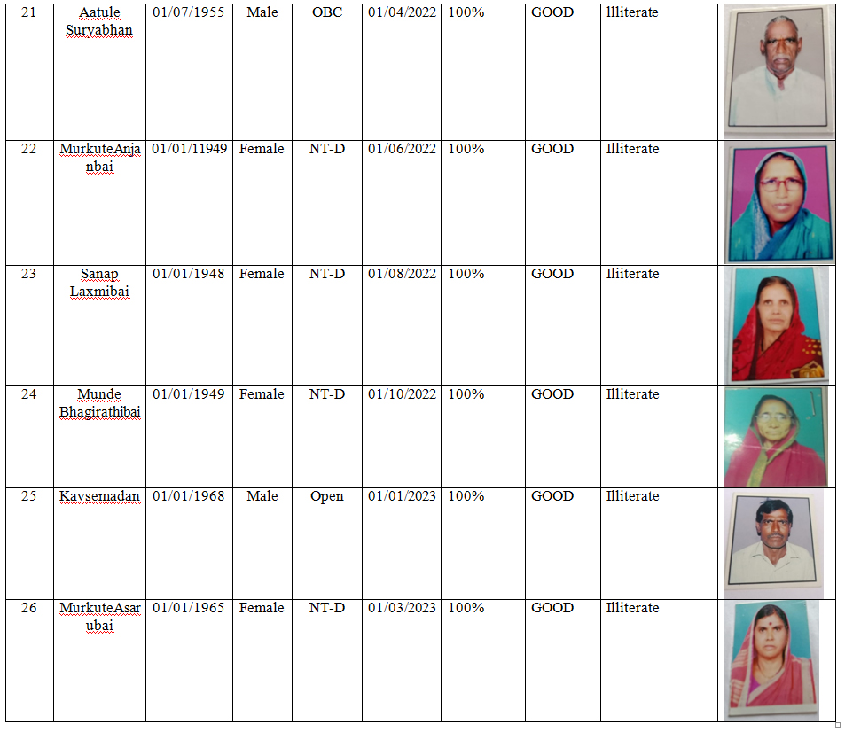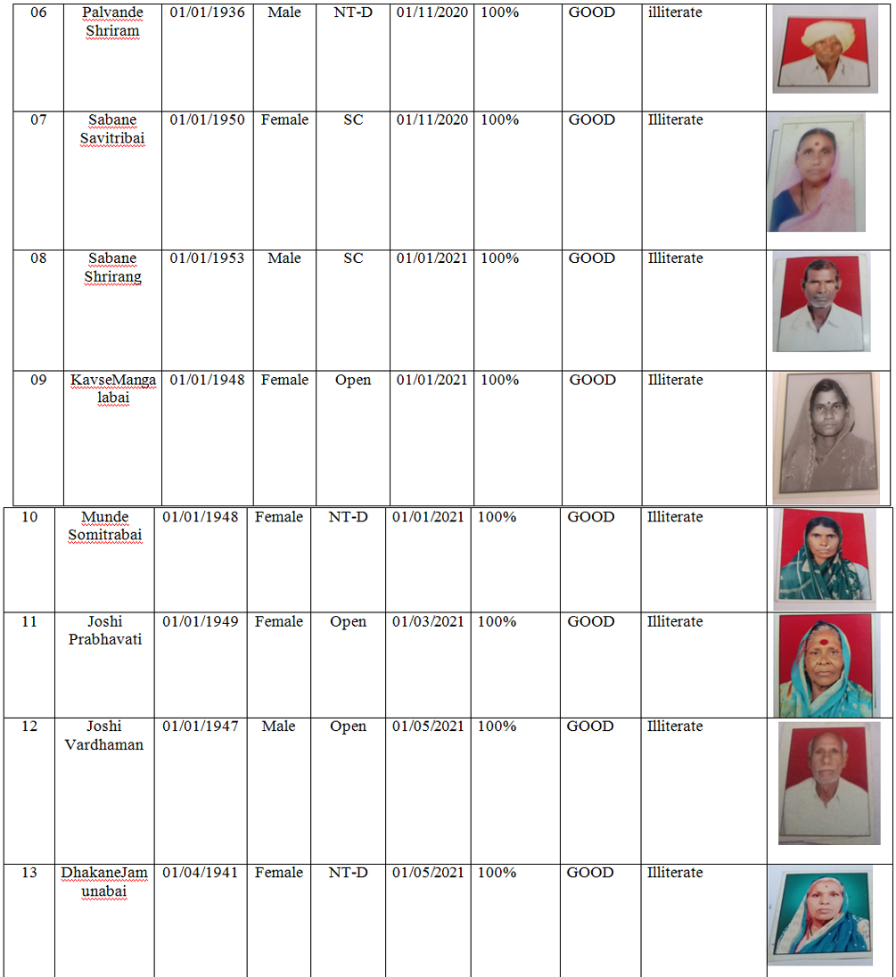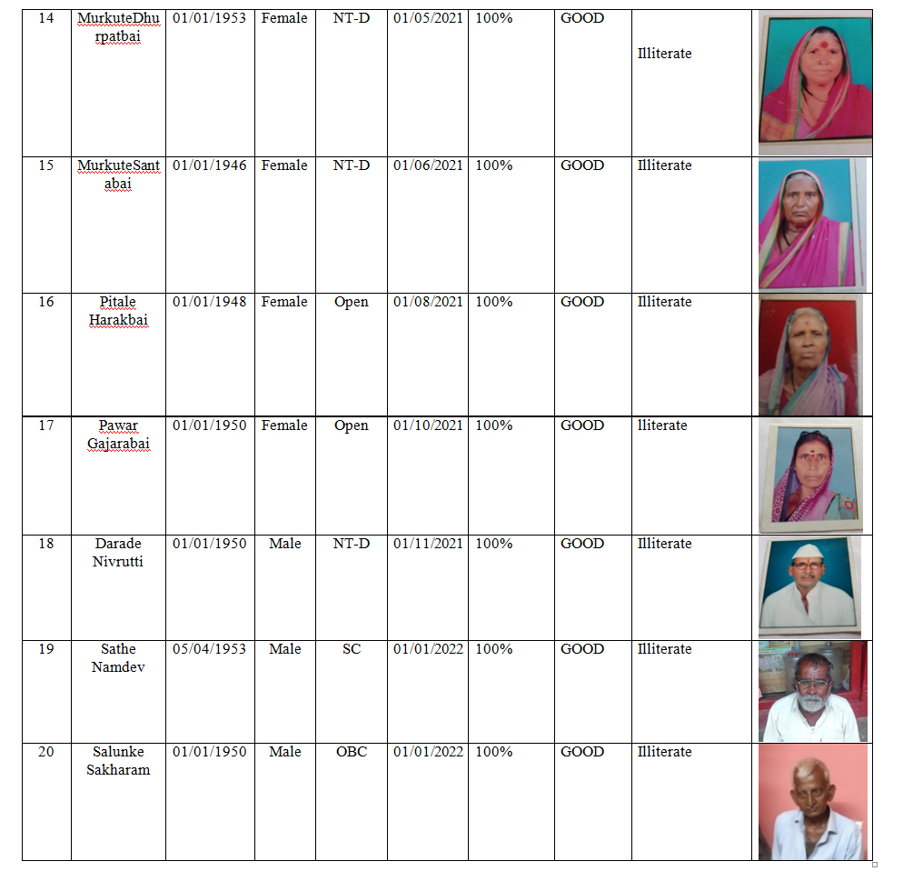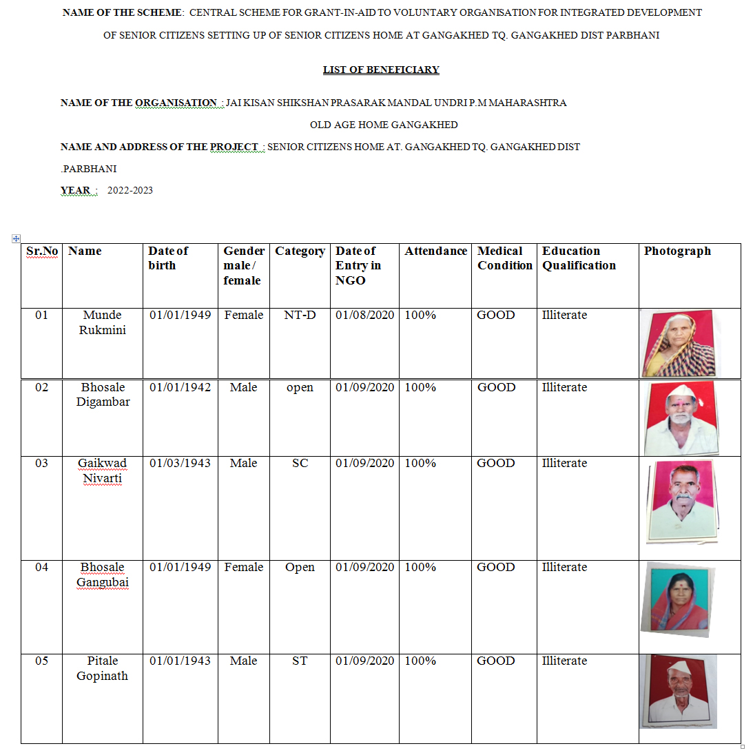 MINISTRY OF SOCIAL JUSTICE & EMPOWERNMENT NAME OF THE SCHEME: CENTRAL SCHEME FOR GRANT-IN-AID TO VOLUNTARY ORGANISATION FOR INTEGRATED DEVELOPMENT OF SENIOR CITIZENS SETTING UP OF SENIOR CITIZENS HOME AT GANGAKHED TQ. GANGAKHED DIST PARBHANI LIST OF BENIFICIARIES NAME OF THE ORGANISATION : JAI KISAN SHIKSHAN PRASARAK MANDAL UNDRI P.M MAHARASHTRA OLD AGE HOME GANGAKHED NAME AND ADDRESS OF THE PROJECT : SENIOR CITIZENS HOME AT. GANGAKHED TQ. GANGAKHED DIST .PARBHANI YEAR : 2021-2022